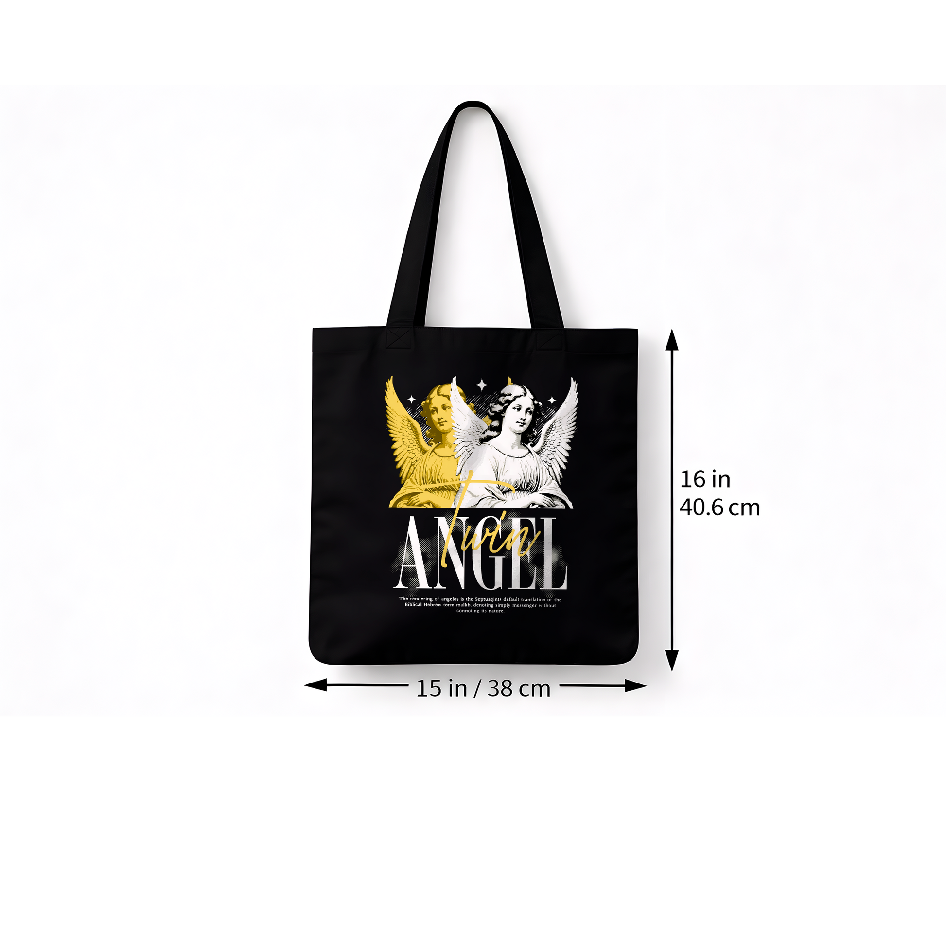 Bolsa Tote Bag Negra “Twin Angel” – Diseño Ángeles Dorado y Blanco