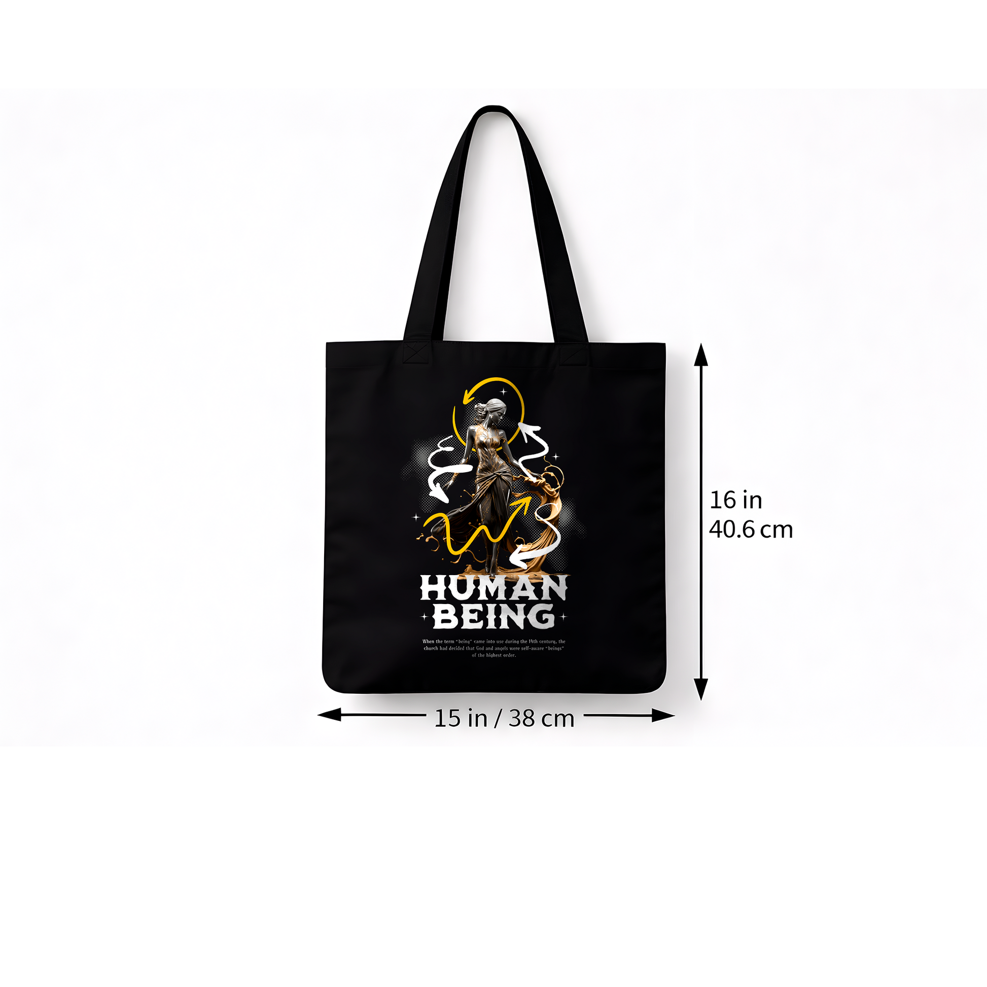 Sac tote noir en coton épais avec design artistique « Human Being » aux accents dorés, imprimé en DTF haute qualité. Un sac urbain au style symbolique et contemporain, résistant et pratique pour un usage quotidien.