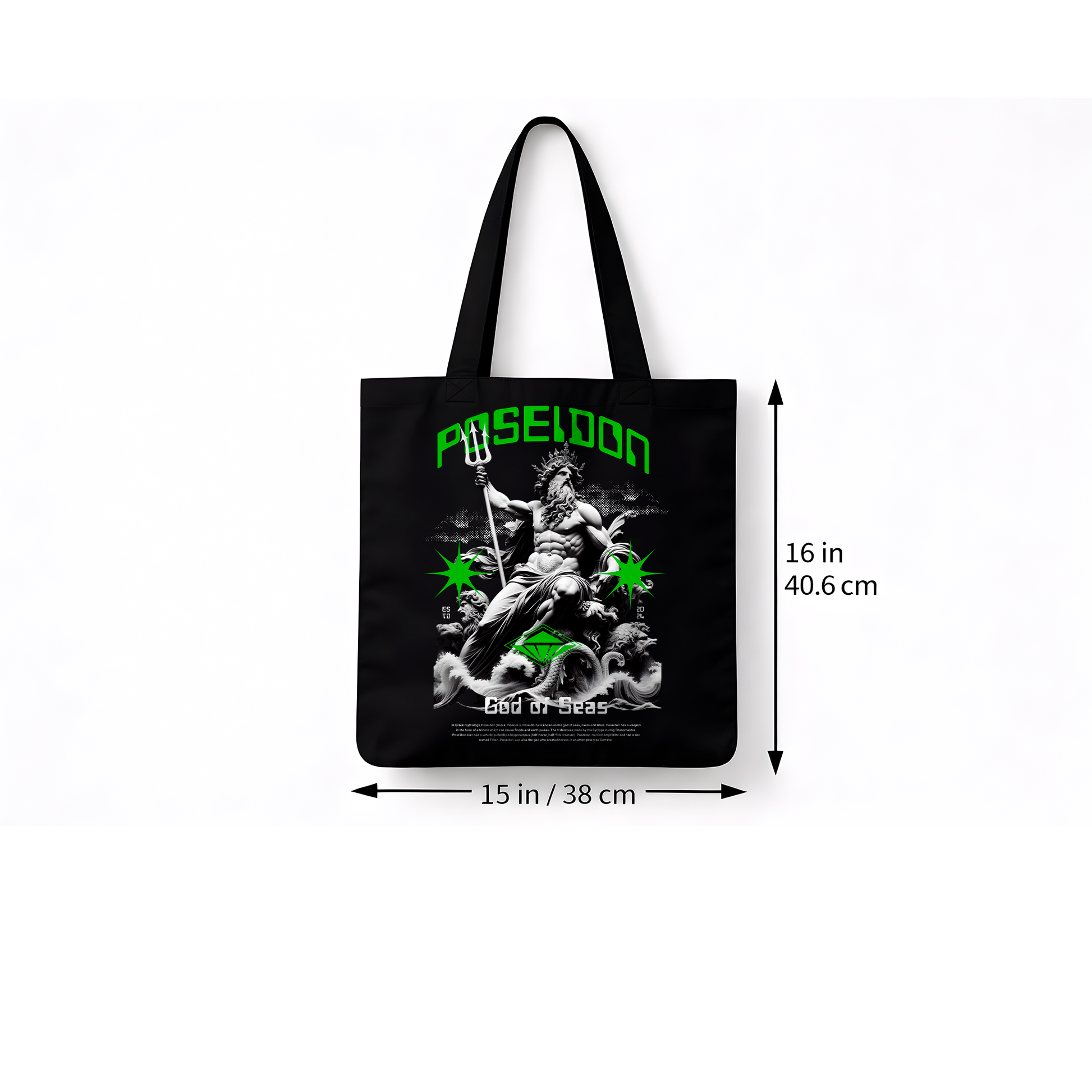 Sac tote noir en coton épais avec design mythologique Poseidon – God of Seas, imprimé en DTF haute qualité. Style urbain puissant, résistant et pratique pour un usage quotidien.